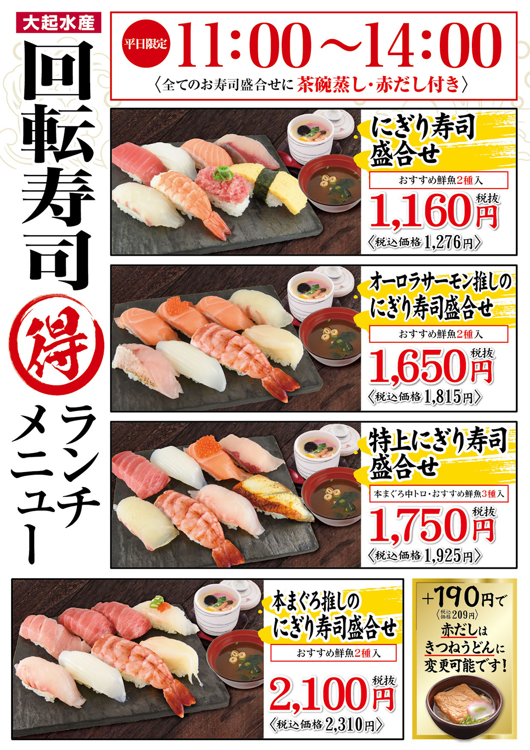 大起水産 回転寿司 なノにわ店では、 平日11:00~14:00限定でお得なランチメニューをご用意。 すべての寿司盛合せに、茶碗蒸し・赤だし付きで満足感たっぷり。 おすすめ鮮魚を楽しめるにぎり盛合せから、 オーロラサーモン・本まぐろ推しの特選盛りまで、 用途や気分に合わせてお選びいただけます。 さらに+190円(税抜)で、赤だしをきつねうどんへ変更可能。 平日だけの贅沢ランチを、ぜひなノにわ店でお楽しみください。