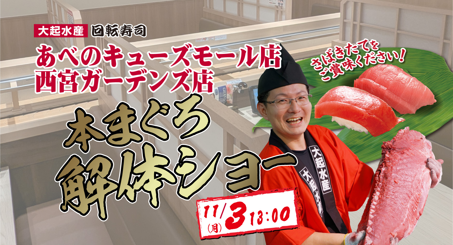 【11/3(月・祝)】生・本まぐろの解体ショー実施!! ~回転寿司あべのキューズモール店&西宮ガーデンズ店~