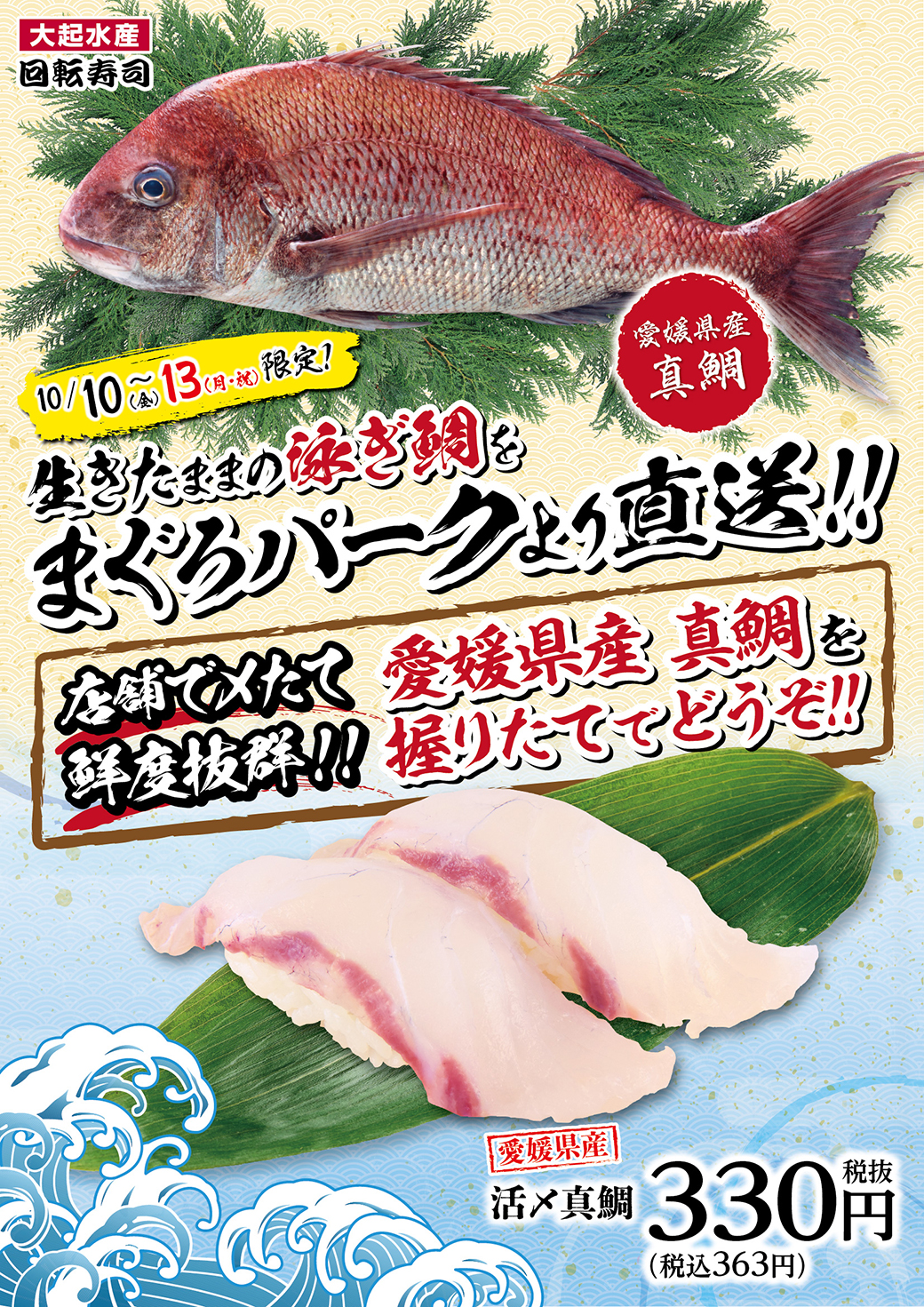 10/10(金)~10(月・祝)までの期間限定で生きたままの泳ぎ鯛をその場で捌いて