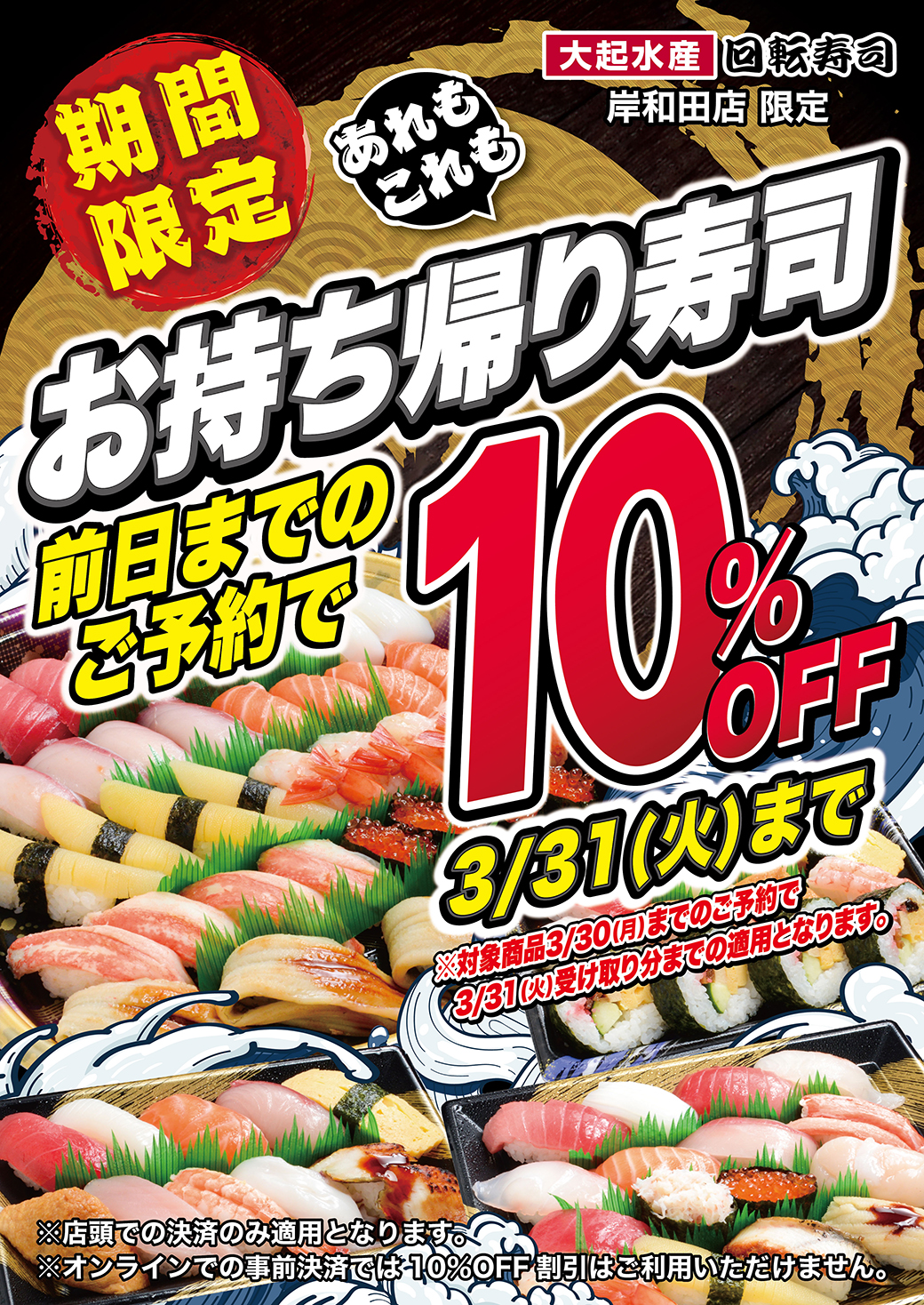 お持ち帰り寿司を特別に10%割引にてご提供いたします。